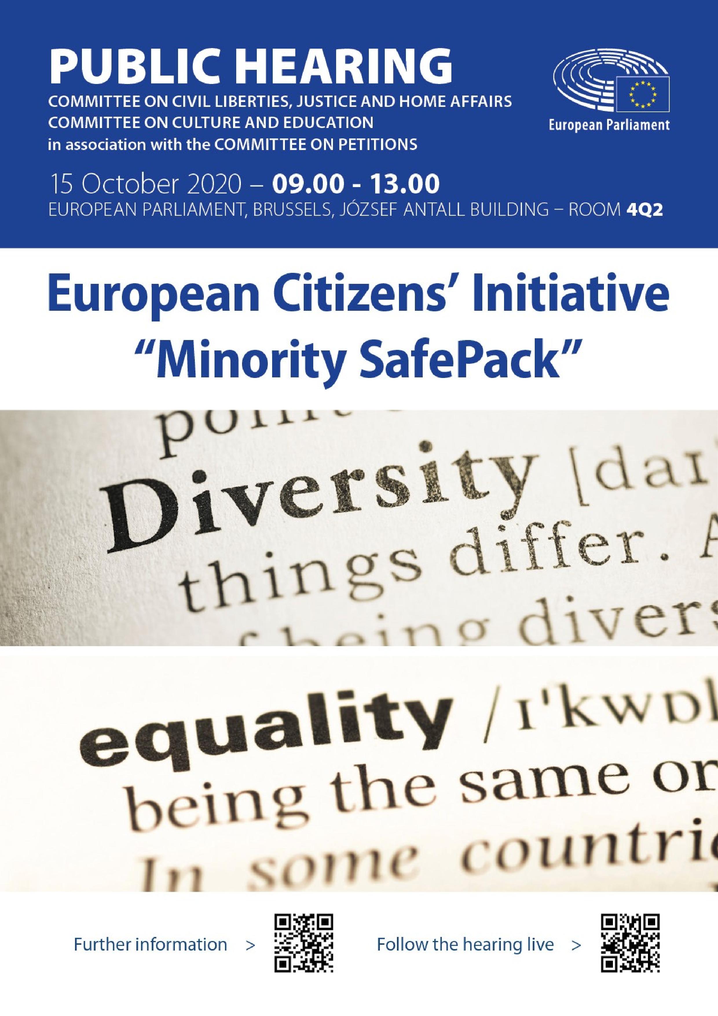 12.10.2020The Public Hearing on the Minority SafePack European Citizens’ Initiative (MSPI) in the European Parliament will take place on 15 October 2020 from 9.00 to 13.00 CET with remote participation.