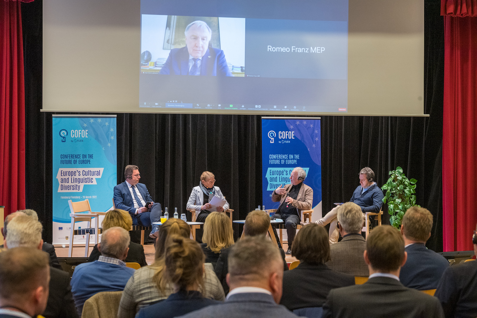29.03.2022What can the European Union do to ensure that its minorities enjoy better rights? "It is the EU's damned duty that the results of conferences like this do not end up in the dustbin of European history", said Karl-Heinz Lambertz at the Conference on the Future of Europe organised by FUEN in Flensburg/Flensborg on 28 March. The President of the Parliament of Ostbelgien (the Parliament of Germans in Belgium) does not believe that a universal solution exists: “I think it is an illusion that we will ever find a ready-made model for minorities that will solve all our problems”. And this is why it is of high importance that representatives of the minorities come together at events like this and formulate together their requests and asprirations.